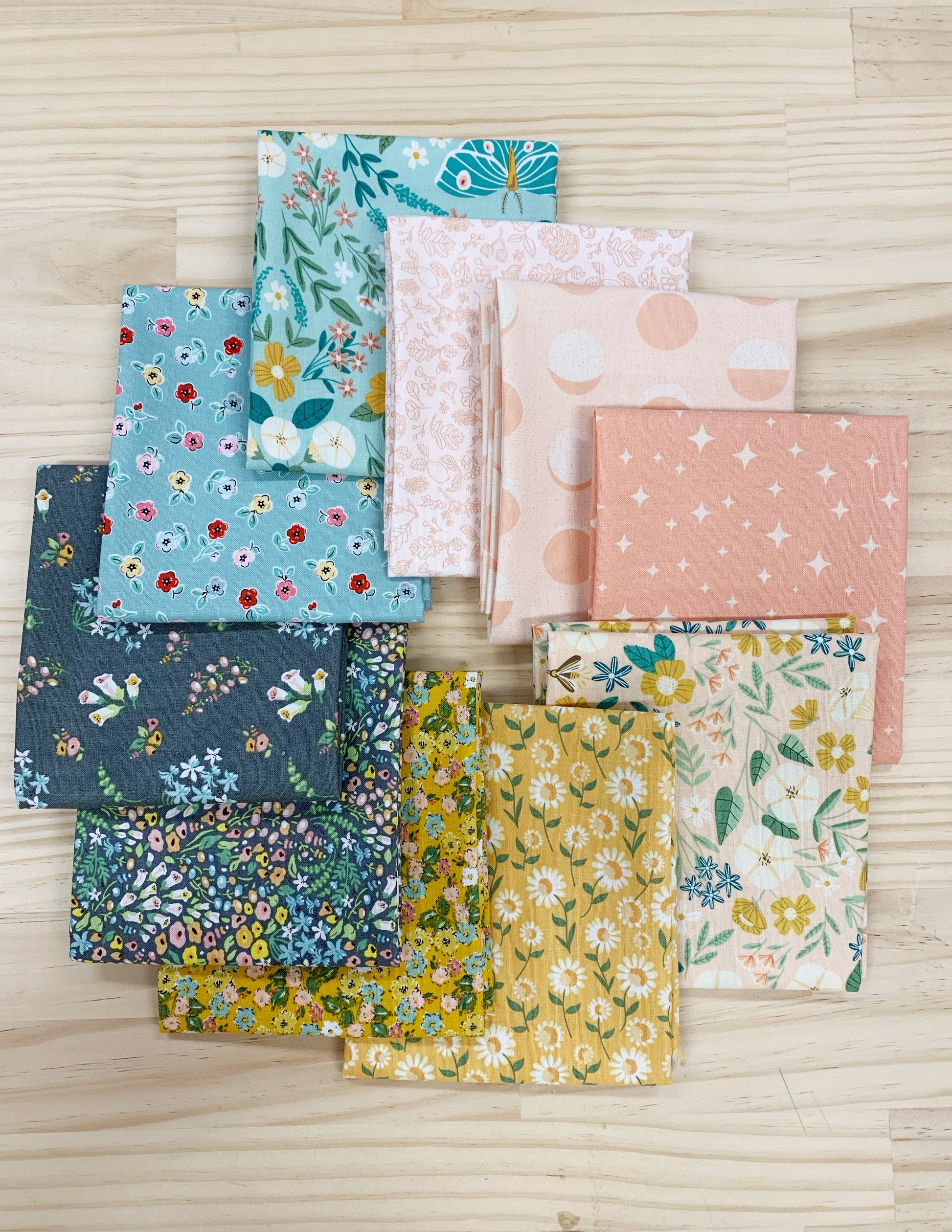 This curated bundle of 10 fat quarters is perfect for quilting, patchwork, and sewing projects. Each piece is hand-cut to approx. 20" x 22" and features soft florals and sweet prints.